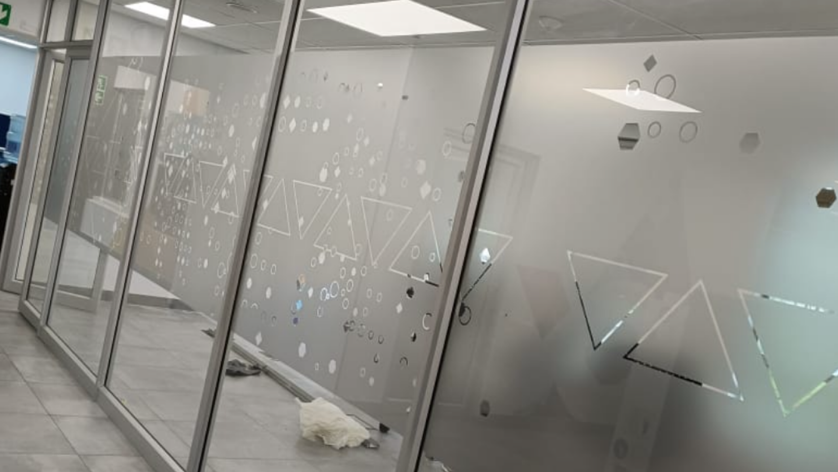 Decorative and functional glass branding, including frosted vinyl, privacy films, and branded window graphics for offices and commercial spaces.